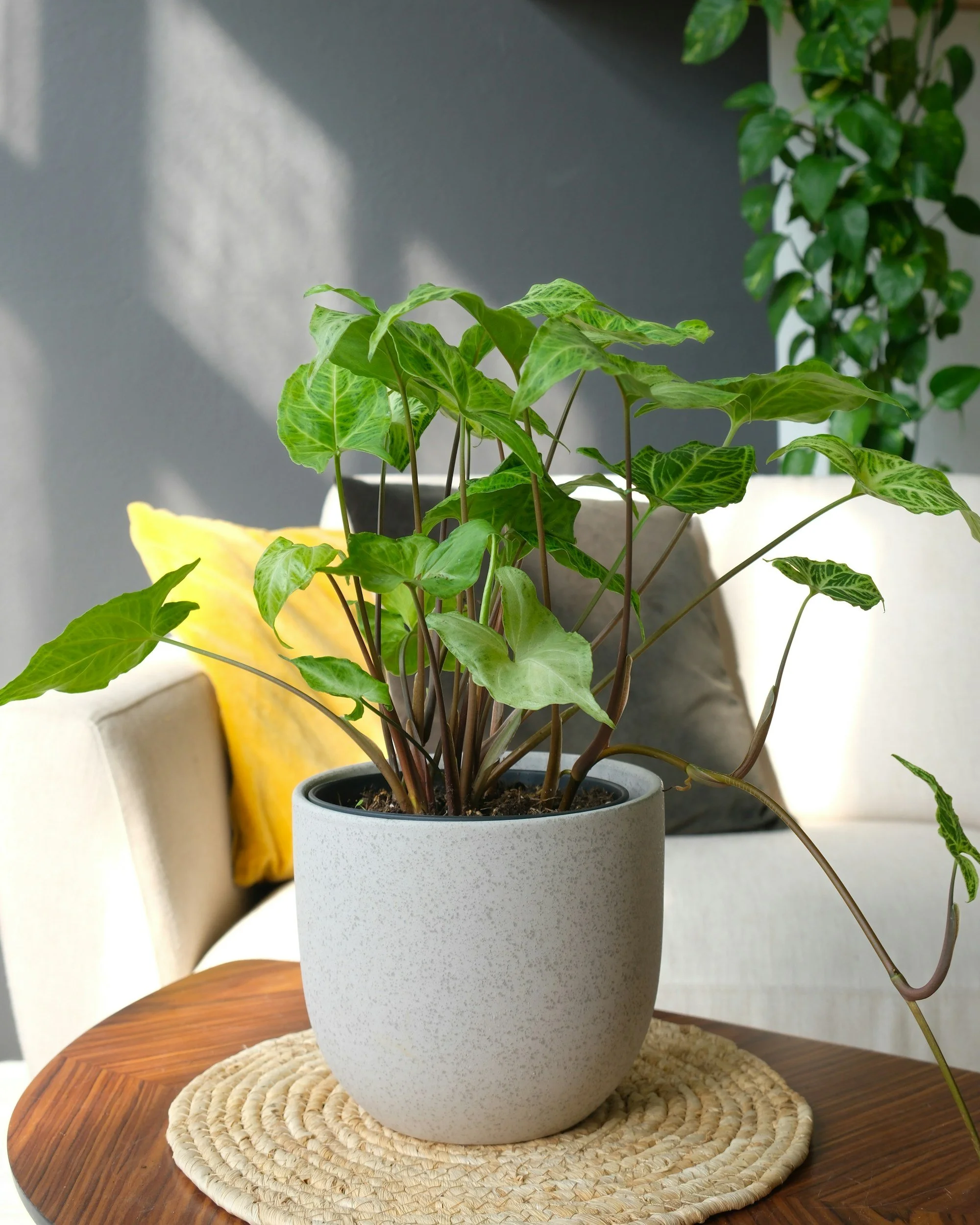 Syngoniums enjoy high humidity and make great additions to a bathroom space. Prune wilting leaves to allow for more growth.